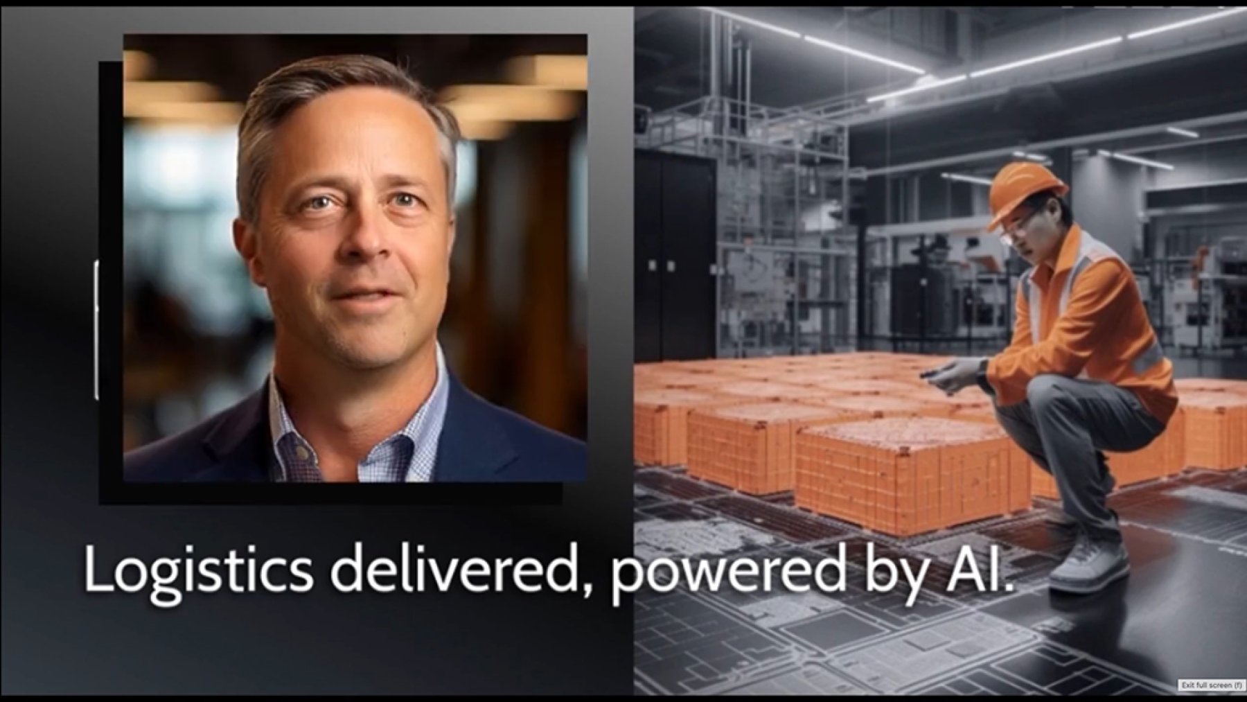 Executive in mid-American accent: 'Good afternoon, everyone. I'm David Palmer, CEO of ChatFOS, and I'm here to talk to you today about how we're transforming logistics with AI-generated design…'