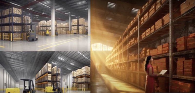 Screen right: #WestBengalesewoman checks inventory in a dusty warehouse that glows with golden afternoon light …