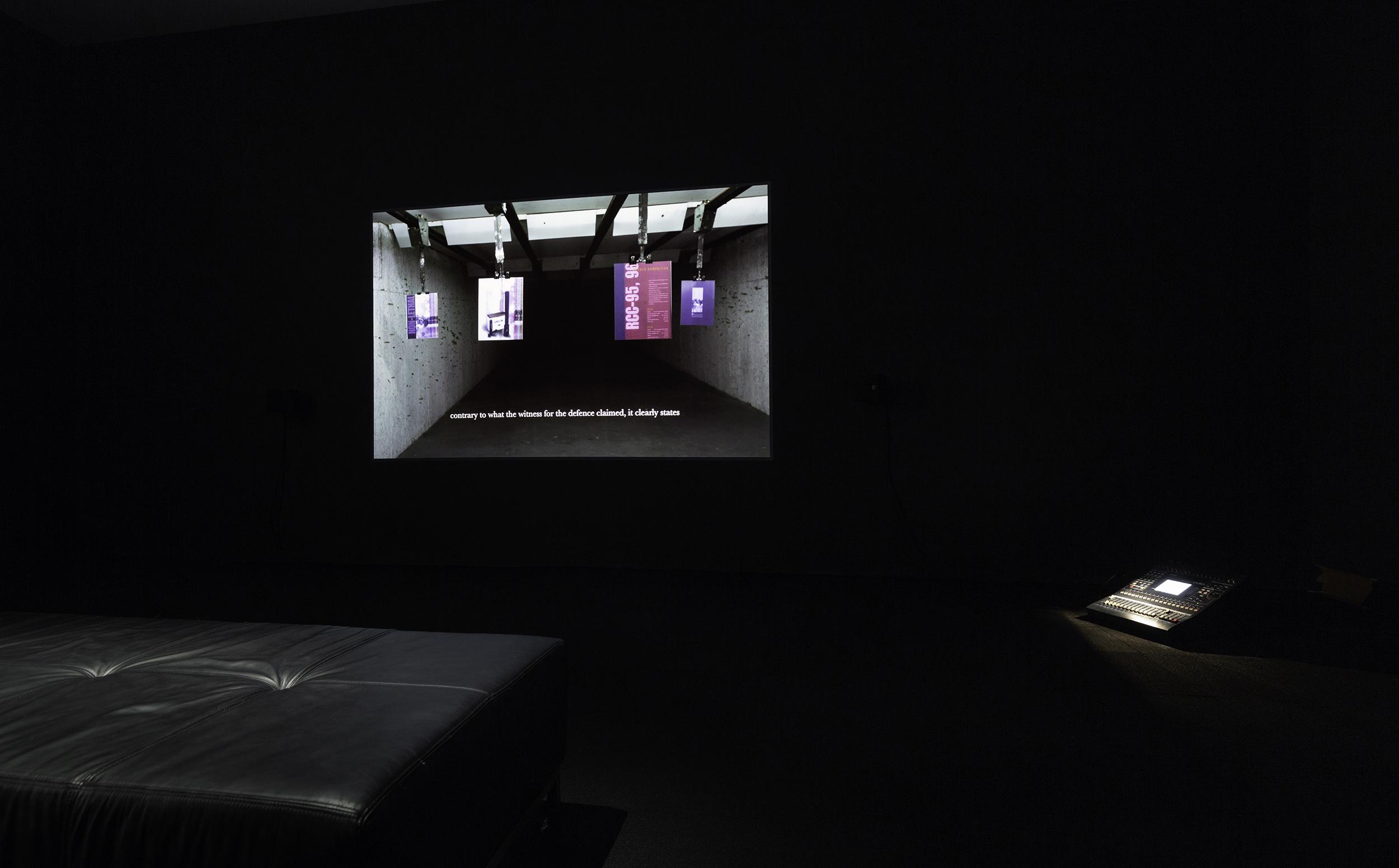 Installation view of Eavesdropping at Ian Potter Museum of Art, Melbourne. Center: Lawrence Abu Hamdan, Rubber coated steel, 2016, HD video, sound, 30 mins. Bottom right: Lawrence Abu Hamdan, Saydnaya (the missing 19dB), 2017, sound installation, 12 mins 48 secs. Image courtesy of the artist, Maureen Paley Gallery, London and Mor Charpentier Gallery, Paris.