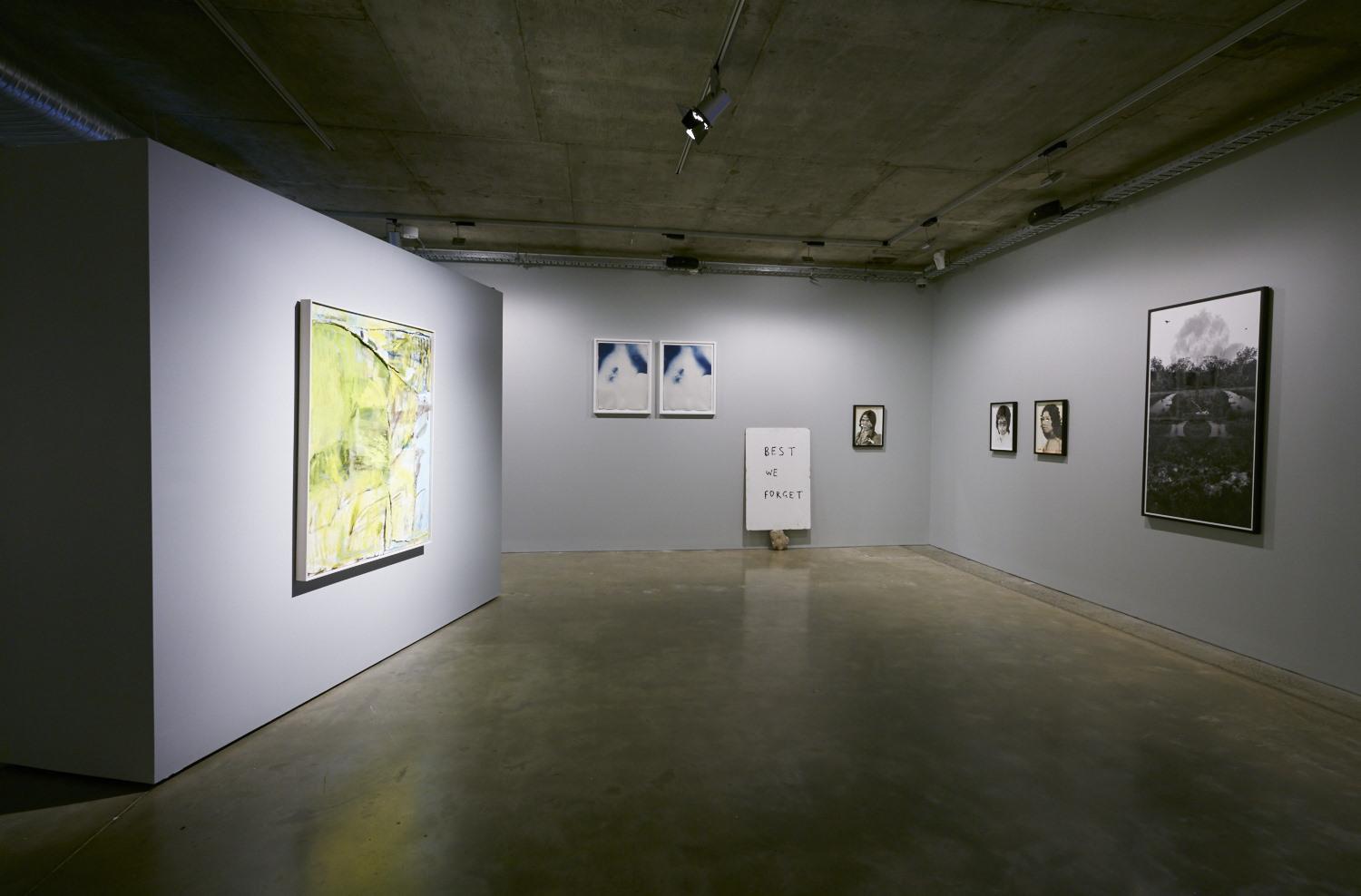 In A World of Wounds, installation view at Artbank, Sydney. From left to right: Teelah George, Yellowing Light, 2017, Spence Messih, River beneath the river (I & II), 2017. Cyanotype on 300gsm Arches coldpress watercolour paper. 56 x 76 cm (framed). Courtesy of the artist and Artbank. Dean Cross, Untitled Slogan Painting, 2017. Synthetic polymer on found particle board, Ngunnawal stone. Courtesy of the artist. Nathan Beard, Chu, 2014-2017. Inkjet print on Canson Baryta and Swarovski crystals on paper. 35.5 x 48cm, 51 x 38.5cm (framed). Courtesy of the artist and Artbank. Nathan Beard, Noi, 2014-2017. Inkjet print on Canson Baryta and Swarovski crystals on paper. 35.5 x 48cm, 51 x 38.5cm (framed). Courtesy of the artist and Artbank. Nathan Beard, Rampai/ Samniang/ Ratana/ Pornjit, 2014-2017. Inkjet print on Canson Baryta and Swarovski crystals on paper. 35.5 x 48cm, 51 x 38.5cm (framed). Courtesy of the artist and Artbank. Hayley Millar-Baker, Even if the race is fated to disappear, 2017. Inkjet on cotton rag. 120 x 80cm. Courtesy of the artist and Vivien Anderson Gallery.