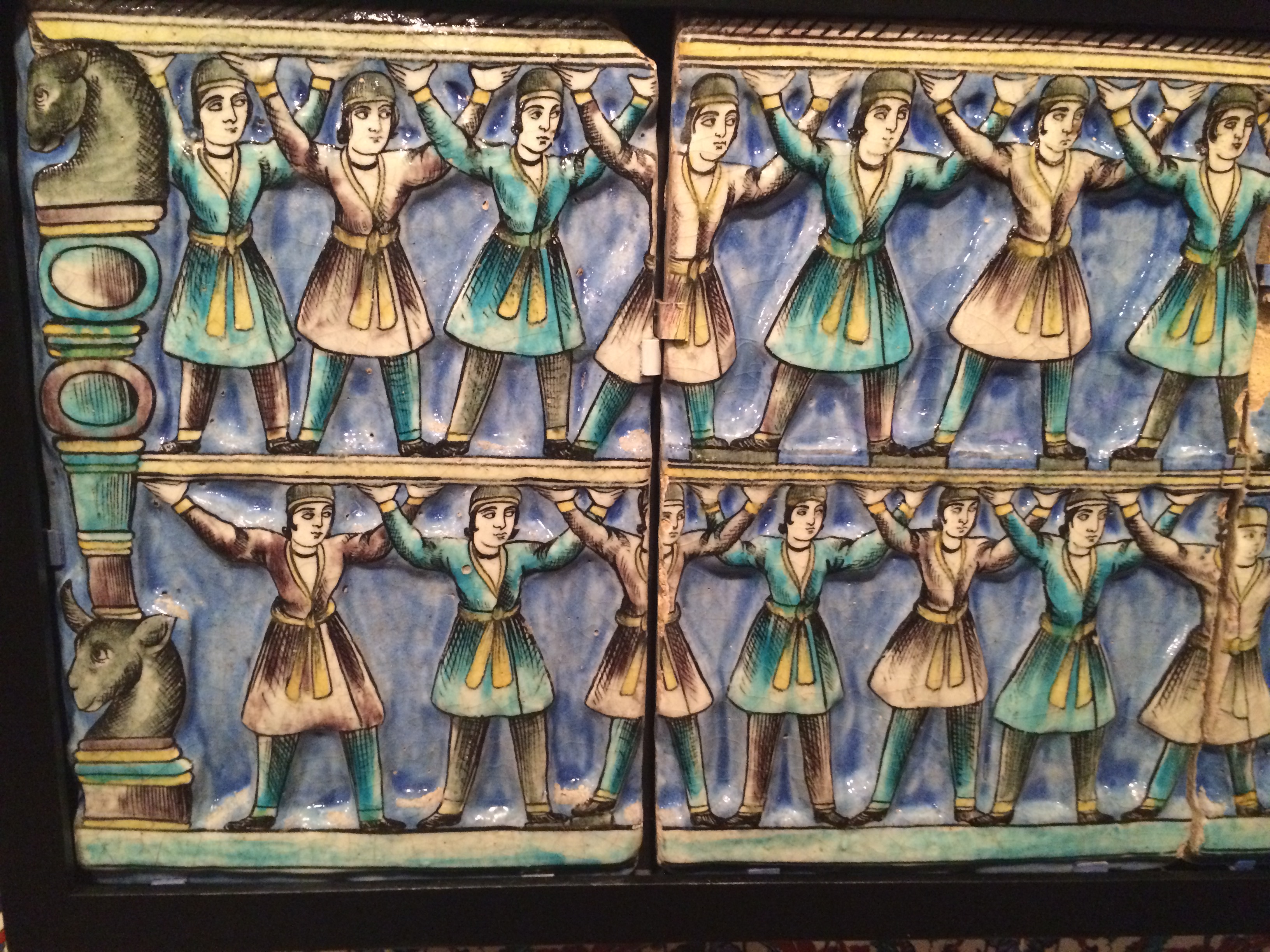 Detail from a series of 19th-century Persian tiles from Shiraz, acquired by the Art Gallery of South Australia in 1973, depicting a conquest of Persepolis.