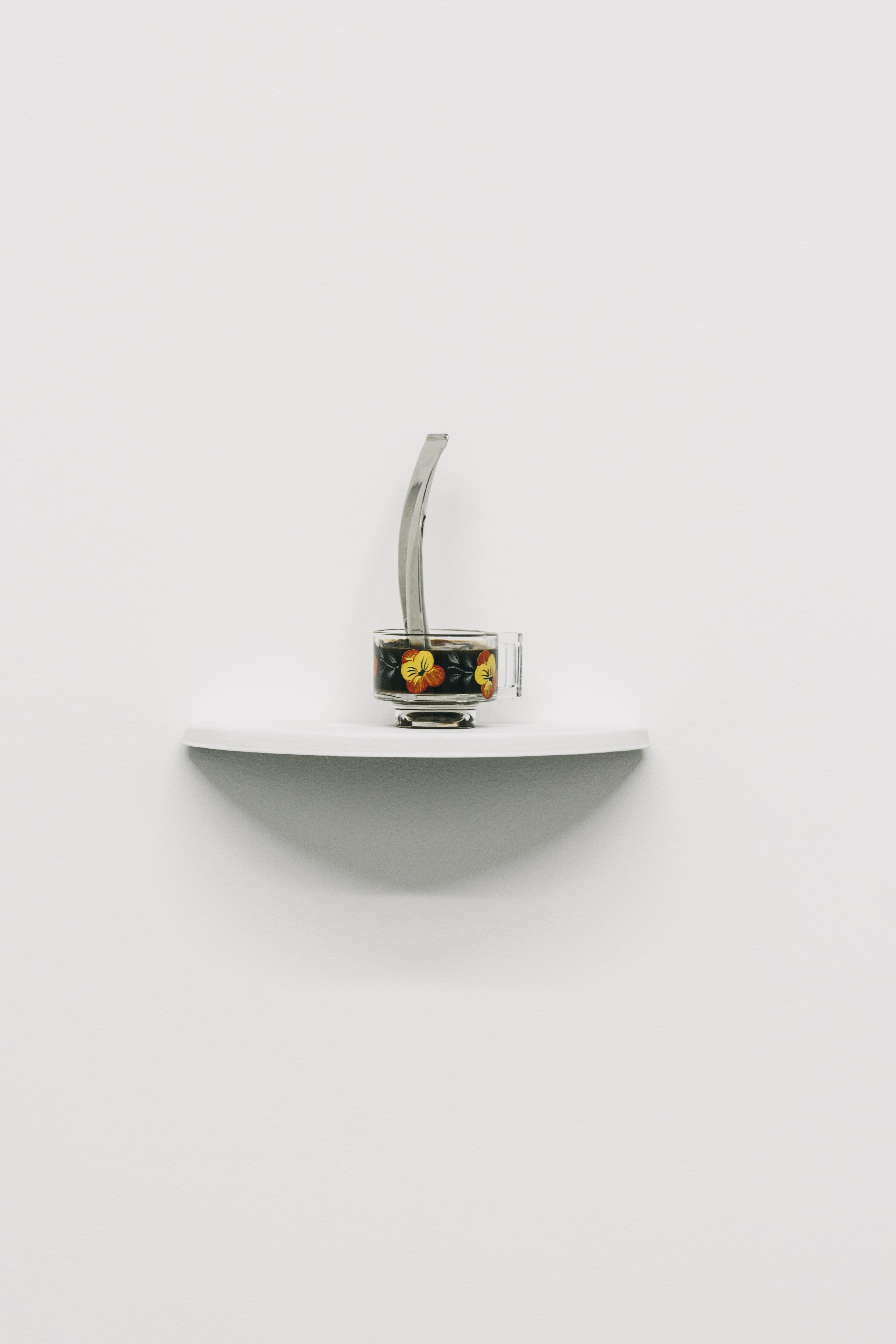 Tim Woodward, Grouphead, 2019. Double espresso two sugars prepared in a corner kitchen stirred with an indirect view of the vocal cords. 21 x 20 x 14cm.