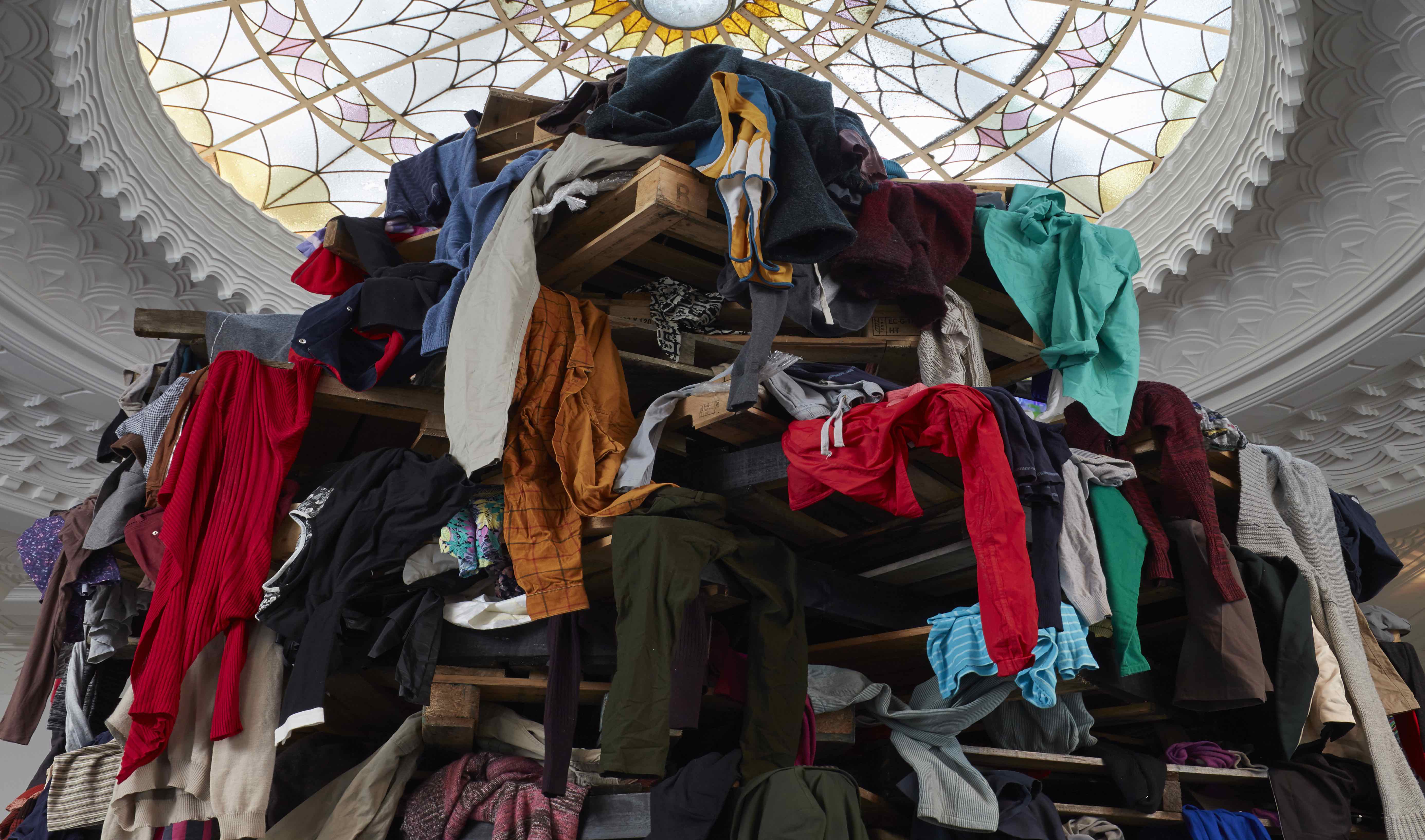 Ruth Watson, 'Geophagy', (detail) 2017 installation with recycled pallets, second-hand clothing, monitors with 5-single channel, looped HD videos.