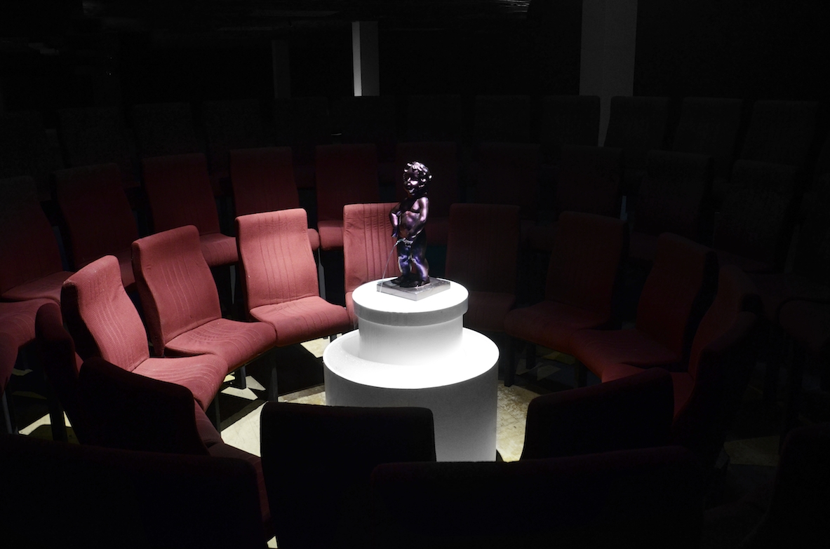 Alan Smithee, Pissing boy, 2016. Manneken Pis replica garden fountain, fiberglass, automotive paint, Lynx Peace for Him shower gel, cinema chairs, pine.