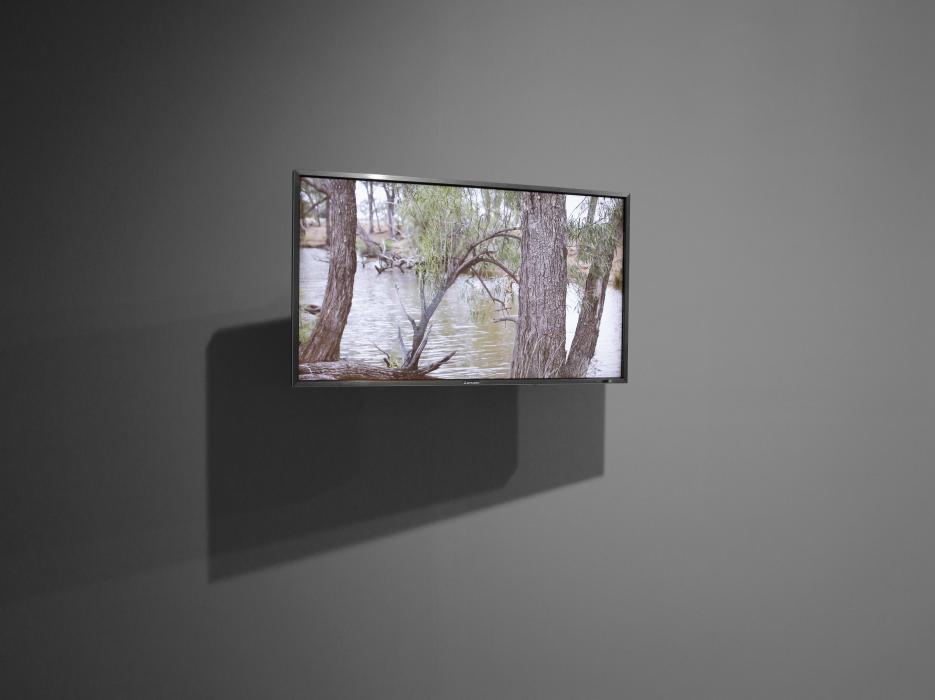 Following river east across the gallery, Departure (2018) captures an Aurizon coal train speeding toward the Port of Abbot Point, adjacent to the Great Barrier Reef; the proposed mine will require expansion of the port and the surrounding seabed. According to the exhibition guide, the train runs close to the Whitsundays—the all seasons gateway to the reef, but the level crossing captured on an overcast day, boom gates down, red lights flashing, seems a world away from tourist fodder. Barbed wire, power lines and fence posts delineate space. A startled crow flies away from the tracks and offscreen before the train blasts across the landscape, reducing the foggy mountain that fills the frame to a backdrop; the contemporary landscape is moving forward, fast and dirty. Behind me, the finch still sings.