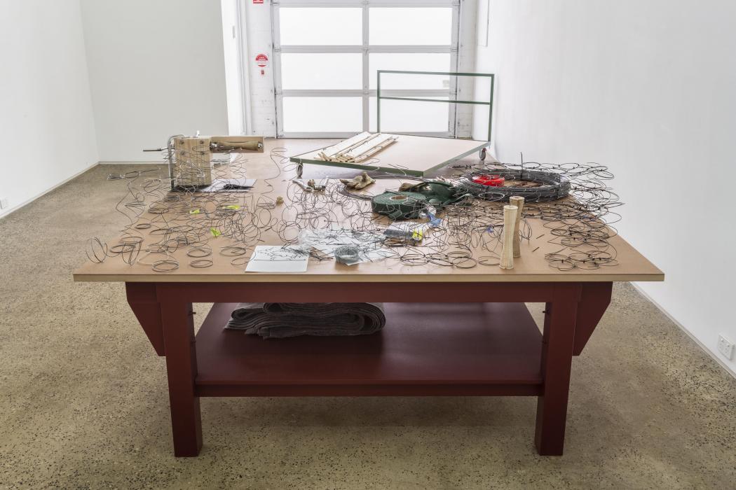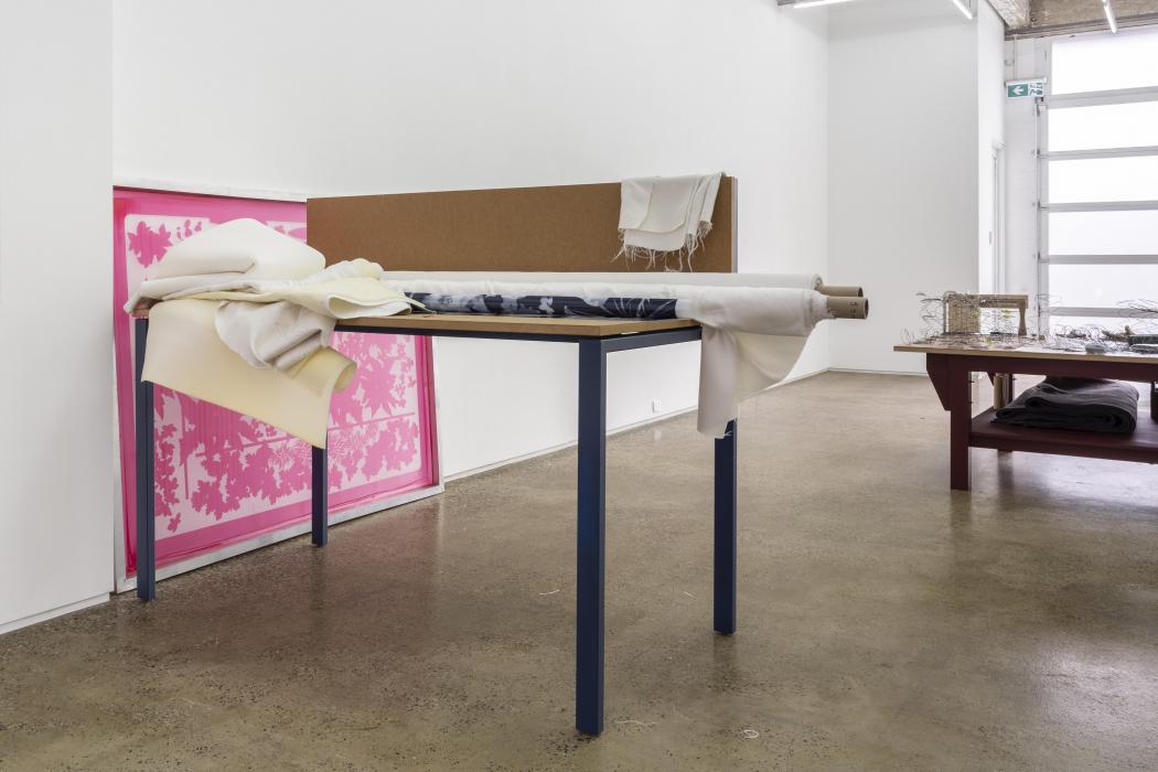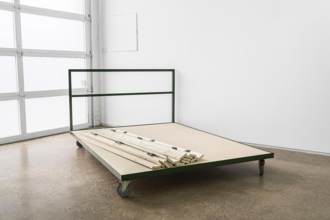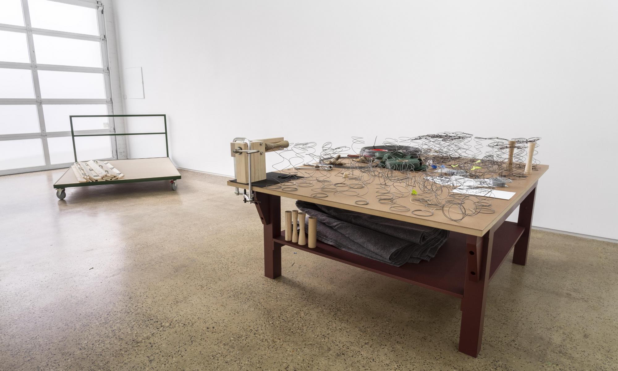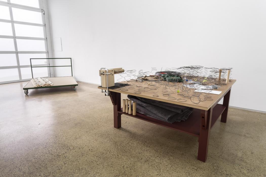 For this exhibition at Gertrude Glasshouse, Panigirakis situates us in a context of material enquiry and social activity circulating, though faintly, the studio of Titorelli—a ‘painter of the court’ from chapter seven of Franz Kafka’s The Trial (1925). For the month of July, Gertrude Glasshouse was used by Panigirakis as a workshop fitted with the means necessary to build a mattress from scratch. Accompanied by a loosely organized group of friends, who will help make the mattress, Panigirakis initiated a process of material research and production that will continue throughout his studio residency at Gertrude Contemporary over the next year. Materially; the exhibition is composed of three work stations presented in a linear arrangement down the gallery. The first station is slightly taller than the second, as is the second to the third. Each station is custom made though their designs are appropriated from standard and familiar forms; imbued with utilitarian design philosophies and the aesthetic vocabulary of post-minimalist sculpture. Each station is fitted with tan wooden tops with metal legs and armature of differing colours. The first, for fabrics and screen-printing, is a deep blue. The second, for springs and woodworking, a deep red. The third, for constructing the bedframe as well as presentation, deep green. Importantly, these are not direct representations of furnishings described in The Trial, instead these are active workstations used in an allegorically dense process of material and social engineering. The manufacturing work is done, though not strictly, outside of operating hours to evade the ‘performing labor’ paradigm and historically grandiose narratives of the ‘artist at work’. This project is interested in a considerably more open field of allusions, affinities, signs, stories and materials all of which are suspended in a gallery exhibition context; notably different to the artistic field and context for which Titorelli worked. Titorelli was a worker tasked with the production of portraits of members of the court. His studio, as emphasized in the didactics accompanying the exhibition, was small and a mattress took up most of the space. His subjects would sit on the mattress as they were painted. Apparent Acquittal is not a re-telling—it’s a playful game guided by two narrative arcs. The Trial and the material realization of a mattress are running simultaneously, but the exhibition resists and withholds from representation, tableaus and explicit comparative analysis.
