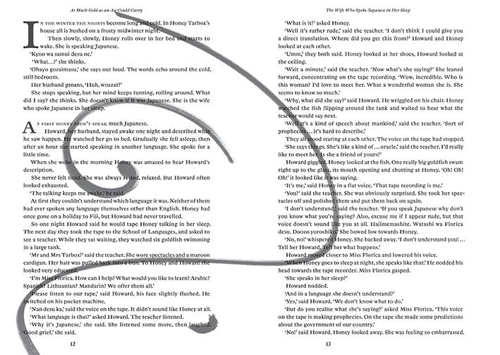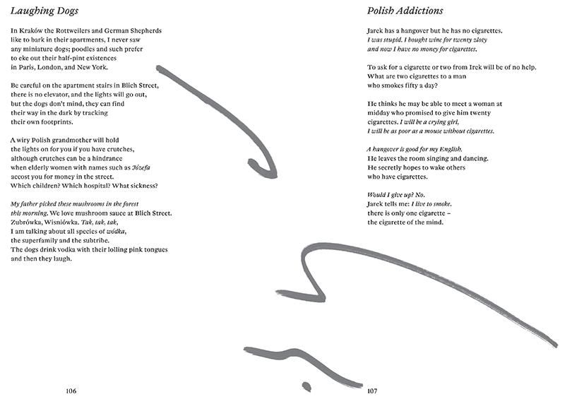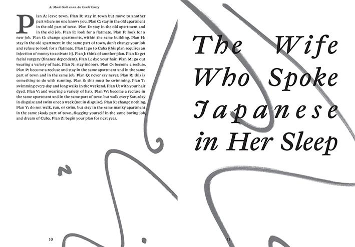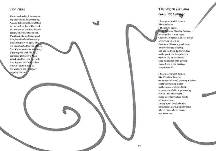 When I first heard about this book, I was intrigued not only by Plumb’s work, but the nature of the collaboration with Otto, which was ‘initiated by split/fountain as part of their ongoing engagement with publishing as a performative act’. Based in Auckland, Otto produces minimal black-and-white line drawings that have an improvised, cartoonish quality. For As Much Gold as an Ass Could Carry, these are further reduced to abstracted swishes, squiggles and strokes that look as if they’ve been done with a fat marker pen. Resembling deconstructed signatures, they glide across the cover and pages, over and between Plumb’s words—playful gestures that draw attention to the construction and contrivance of each page of text. These forms are subtly mimicked by an italic serif typeface, which features on the bright yellow dust jacket and titles throughout the book.