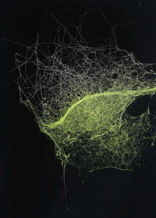 Sandra Selig’s Universes (2007) comprises fifteen small works which reveal enamel sprayed spider-webs fixed onto paper. The webs are captivating, the delicate detail almost fabric like, with rips and holes and straggly strands, like galaxies, 3D renderings, torn stockings and dust balls. I wonder what the spider makes of the stolen web if, as mentioned in the catalogue they were golden orb spiders, as these spiders build mostly semi-permanent webs, often consuming and repairing these on a daily basis. These incredible, ad hoc and delicate webs are at odds with Selig’s own accomplished sculptural thread work, which in comparison appears over controlled and calculated. By contrast Sean People’ sculpture Irrational—Non-cartesian—Emotional (2015) harnesses something of the working method of non-human animals, as if some strange bird, in finding the silver pipes sticking out of a wall, has decided that it would create the perfect nesting place, and gathered sticks and objects (seemingly from a miniature dolls’ house) to make its home.