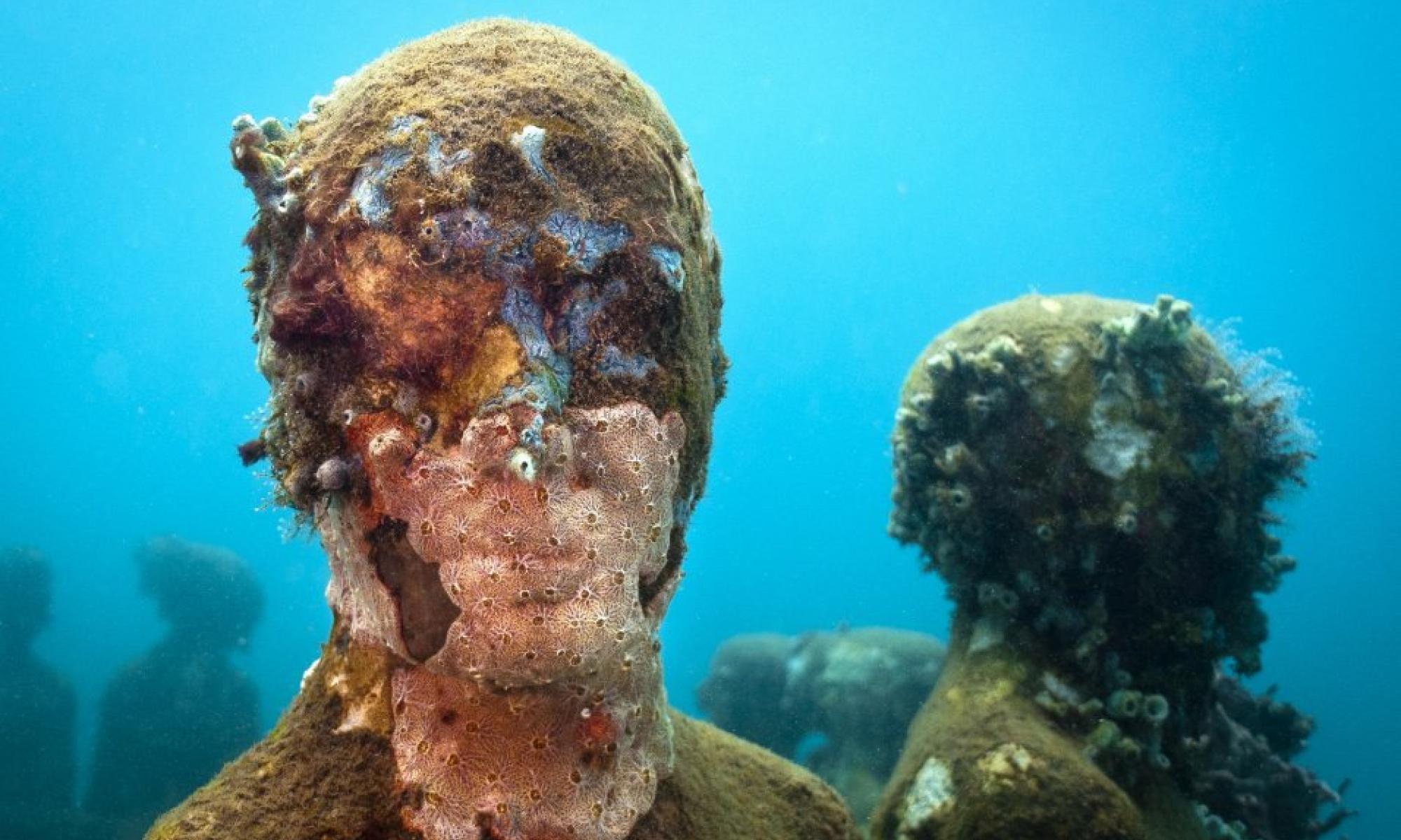 Jason deCaires Taylor’s video Human nature (2012) depicts his large-scale projects that create the conditions for artificial reefs by anchoring pH neutral cement sculptures into the seabed. An accomplished underwater photographer, the artist reveals the stunning layers of growth and transformation; and the rather formulaic cast figures become metamorphosed by the incursions of corals, barnacles and sponges (to name a few). The eerie sculptural human forms engage the viewer by evoking the monstrous and mortal; the body rejoining the earth, being grown over, eaten into, consumed.