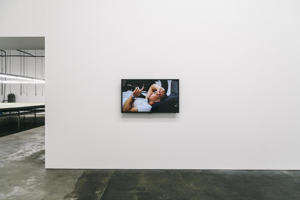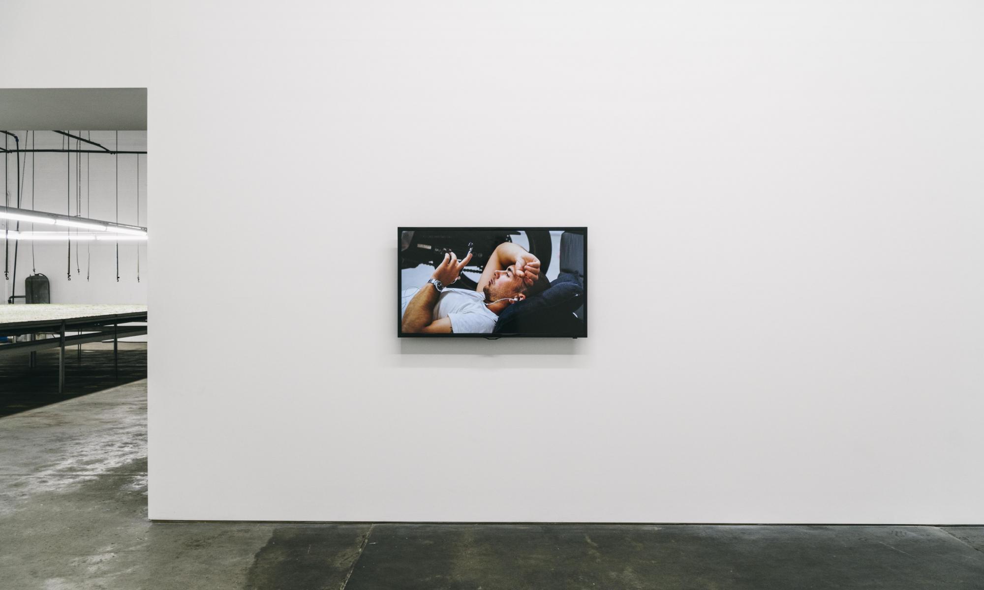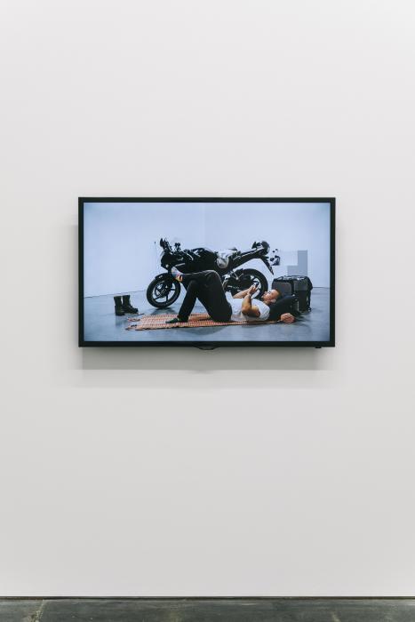 In the work Silent Aspiration (Conglomerate Gulp), Woodward’s selection of objects suggests an upper middle-class experience of professional work; goji berries, pistachios and an Alpha 60 brand button conjure visions of a health-conscious arts administrator rather than a stereotypical white-collar office worker. This inferred middle-class perspective and aestheticisation of office work, is juxtaposed against a video work in the exhibition, Sleeping Under a Motorcycle not Sleepy (2019), which focuses on an off-duty food delivery driver, a precarious gig-based profession often undertaken by students and people working multiple jobs.