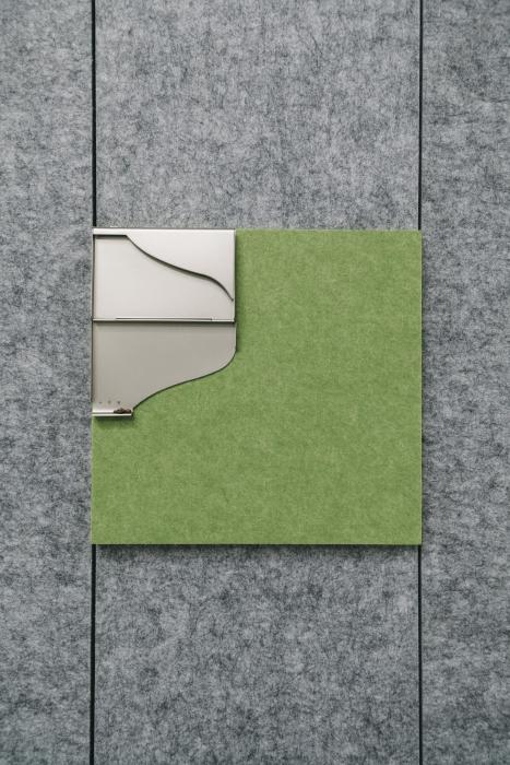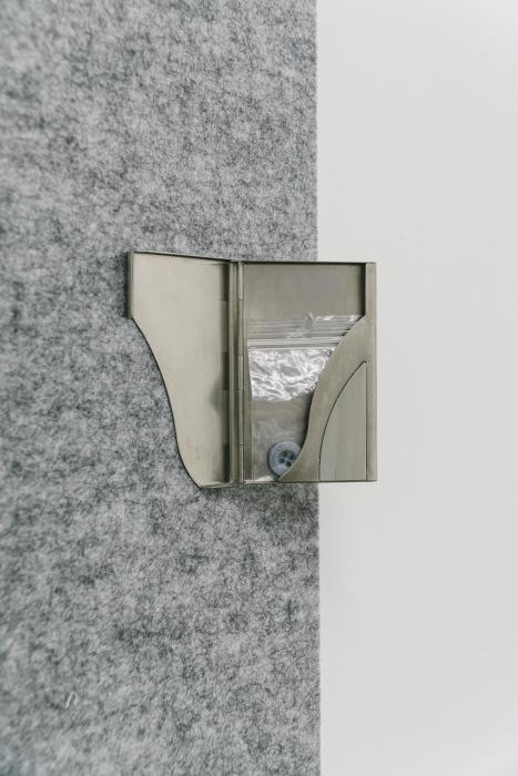 The contrasting textures of the PET panels and slick silver cardholders reflect a familiar office workplace design ethos. The tiny objects resting in each of the card holders give the impression of personal narratives existing within the anonymous corporate office, combining the clinical, uniform textures of offices with the detritus that accumulates when people occupy it. Many of these items could function as private daily coping mechanisms, intended for convenience, comfort, or to increase productivity. Their inclusion acts like narrative seeds into the lives of imagined anonymous office workers.