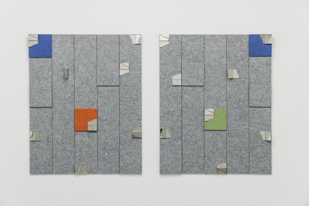Woodward’s sculptural assemblages primarily use objects recognisable for their corporate aesthetic. In the largest wall-based assemblage, Silent Aspiration (Conglomerate Gulp) (2019), Woodward creates a canvas using layered rectangular PET acoustic panels—the kind that line office partition walls to dampen distracting sounds and conversations. A number of the PET panels are arranged on top of a grey backboard in cheery corporate colours—lime green, burnt orange, blue—giving them the look of a corporate felt Mondrian. Mounted on top of the panels are shiny stainless-steel business card holders splayed open, with tiny commonplace objects nestled in their corners. A breath mint, a spare button, a multivitamin, a Nurofen headache tablet, a small round battery, a sunflower seed, pistachio shell and a shrivelled goji berry, all small enough to be swallowed.