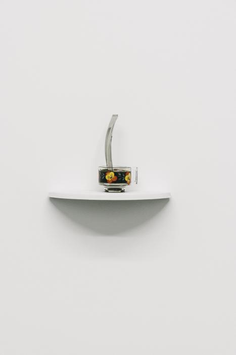 In the work Grouphead (2019), Woodward again uses assemblage to imbue objects with narrative. On a semi-circle shelf mounted on the wall sits a glass espresso cup decorated with garish orange and yellow flowers. What seems to be a metal door handle emerges like a shark’s fin from the dark, sticky-looking coffee inside the cup. Woodward later told me that this object is actually a laryngoscope blade, an instrument used to examine the larynx. From the materials list we learn that this work consists of a ‘double espresso two sugars prepared in a corner kitchen stirred with an indirect view of the vocal cords.’ Grouphead continues in the vein of a number of Woodward’s assemblages under the same title that follow the formula of ‘cup of coffee prepared / in a way / by a person / with object / etc.’ By conjuring the familiar activity of the coffee break, Woodward focuses on the in-between moments that balance on the threshold of work and leisure, productivity and rest.