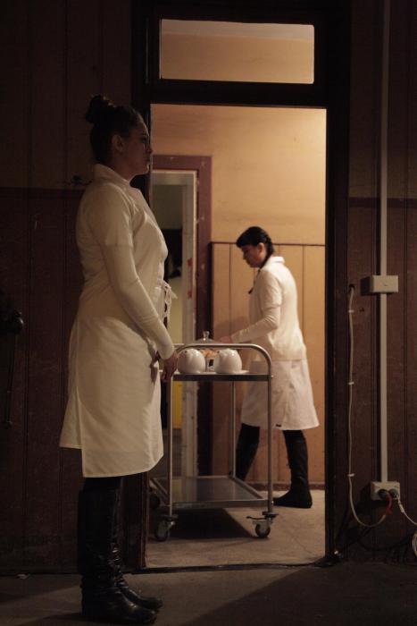 Our hunger grew as we waited outside this door in the dark. From within the shack, a knock was returned, and the door swung open. There stood two performers—Carly Sheppard (a Murri artist of Kutjar descendency) and Naretha Williams (a Wiradjuri woman and experimental artist)—dressed in simple white work dresses and aprons. While absent on the night I attended, trawoolaway performer Sinsa Jo Mansell was also a part of the cast. Their faces set sternly, they gestured in silence for us to enter. As promised the steel table was set for a British-style tea. The rest of the room was spare, both sterile and run-down. Above the worn fireplace hung a ram’s skull. The whitewashed walls peeled and crumbled at the corners. A harsh light shone from above. Our group of eight shuffled awkwardly to our chairs, and our performers began solemnly pouring us cups of tea, laboriously wheeling a cart to each setting, service without the smile.