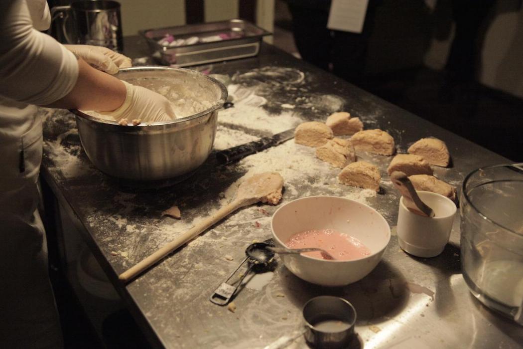 True discomfort is hard to come by, but nothing cuts to the heart of it like food rituals. To refuse food is an offense in most cultures, especially in a formal setting, especially when the ingredients have special meaning to your host. Traditionally, afternoon tea is a domestic framework upheld by women, as an act of hospitality towards the men who consume it. I recall dieting as a teenager, defiantly resisting the cakes and desserts offered at family gatherings, the apparent concern and underlying insult in my hosts’ eyes. Because food is more than just functional, it’s transactional. Food is love, or labour. Norman’s notes on their great-grandmother elicit Sally’s resentment toward the farmhands she was baking for. Norman’s scones, then—given voluntarily—were an inversion of this power dynamic, a kind of transubstantiation: a sacramental offering borne from generations of begrudging servitude. The placard told how Norman’s mother was raised reluctantly Catholic, ‘the residue of the communion wafer in her mouth… the incantations of the Latin mass… the voice of her Granny, who sang the now lost songs of her Country.’[5] Sacrament, in Catholicism, means accepting the suffering that allows you to live free of sin. The spilling of blood—as Norman’s place card detailed— negates trust; Norman’s blood pact reinstates it. And so, should one eat the scones?