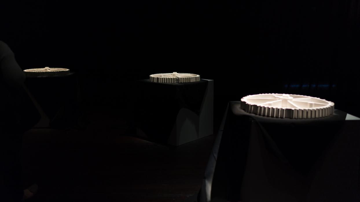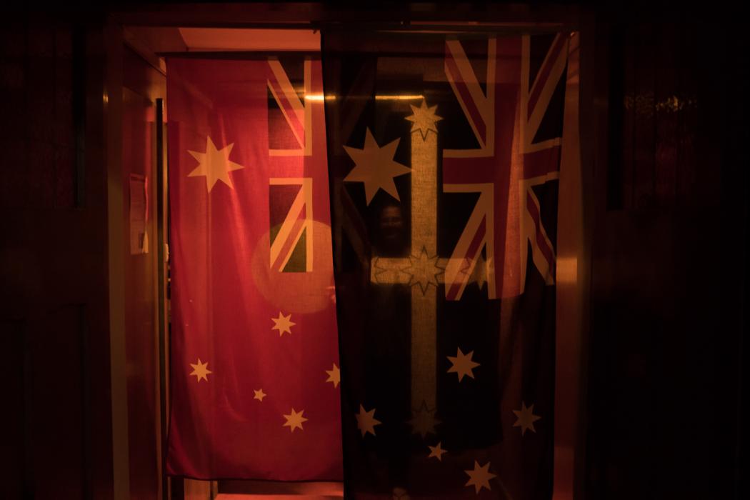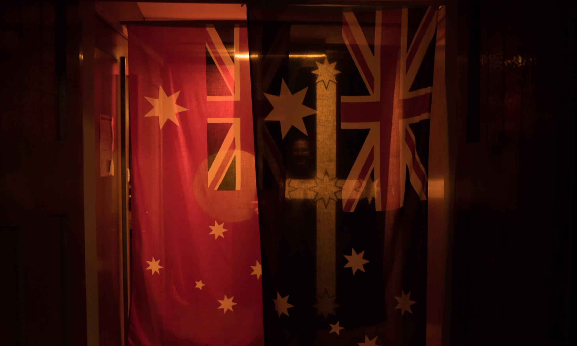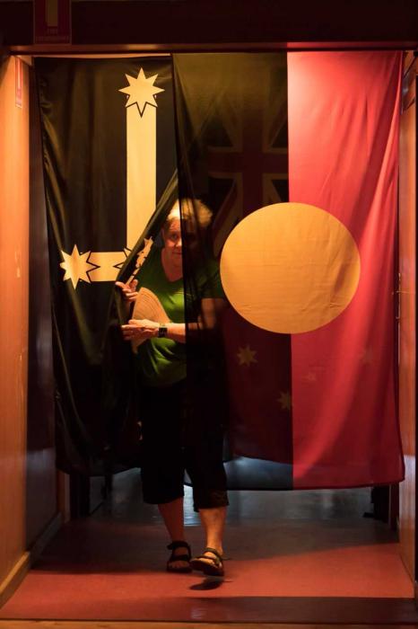The entrance of the space at Vitalstatistix is marked by a short, low ceilinged corridor that leads from the atrium into the hall, here Harkin has hung four flags; the Australian Flag, Australian Maritime Flag, the Eureka Flag and the Aboriginal flag. Within this narrow space, the flags brush against the shoulders of the audience, creating an intimacy not usually associated with these objects. The closeness is disconcerting, with political, often nationalist and racist connotations associated with draping the Australian flag over one's shoulders. Similarly the Eureka flag has become a symbol of Unionism but also carries undertones of violence, divisiveness and nationalism. As symbols, flags aren’t meant to be subjective, but Harkin fragments their meaning, drawing out the contradictions and multiplicities that sit within them. Fragmented conversations paired with a synth-drone soundscape create a reflective and repetitive investigation of personal and family history, exploring how, over time, memories become fragmented and we rely on multiple perspectives to reconstruct meaning.