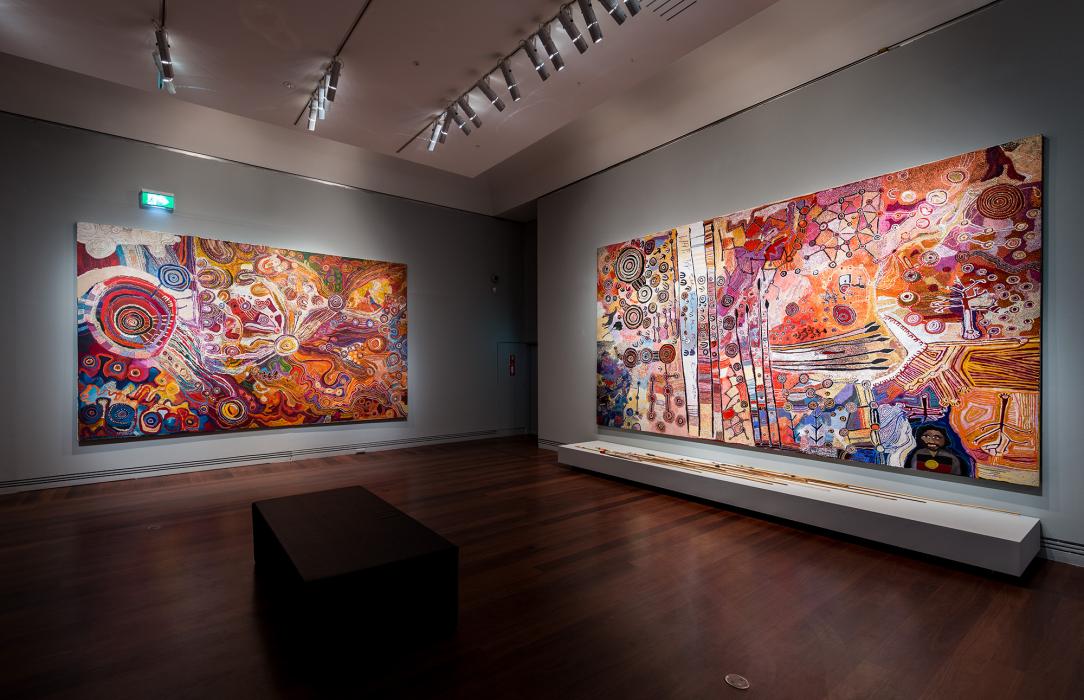 Collaboration is a strong theme across many of the exhibitions and events, placing importance not only on the act of raising the voice of Indigenous artists, but also listening. At the heart of Tarnanthi at the Gallery are two large collaborative paintings from Anangu Pitjantjatjara Yankunytjatjara (APY) Lands artists. Kulata Tjula: a work for Kunmanara (Gordon) Ingkati (2016) is a senior men’s collaborative painting that honours the strong relationships that exist between senior men within the community. The artists draw attention to the importance of collaborative works like this to enact and record collective knowledge within Anangu language, law and culture. The work is dedicated to Kunmanare (Gordon) Ingkati, who is remembered by the 23 artists as a watchman of his culture. Seven kulata (spears) and miru (spear throwers) accompanying the work in memorial of Ingkati and other senior men who have passed away. Alongside Kulata Tjula, the work by APY Women’s collaborative titled Kungkarangkalpa: Seven Sisters, speaks about the vitality of Tjukurpa (ancestral stories) to the 24 senior and emerging artists who contributed. Together the monumentally scaled works are deeply complex and aesthetically striking, each giving intensity and energy to the other.