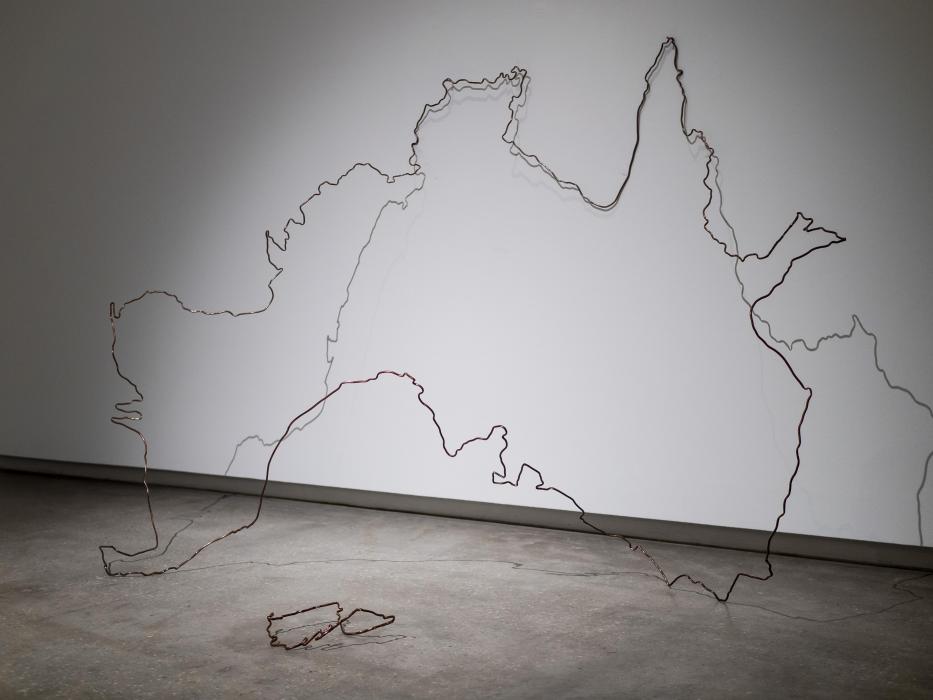 Specifically commissioned for The Tangible Trace, Map Tracing #7 – AU (2019), a work that is reiterated for and with different contexts, sits alongside Gupta’s aforementioned work. The artist has manipulated copper piping in order for audiences to see the work in different formations from different viewpoints. Its materiality is apt, in that copper is an element known to prevent sperm from entering the cervix, and repel slugs and snails from garden plants, an apt metaphor for themes around borders, nationalism, patriotism and belonging.
