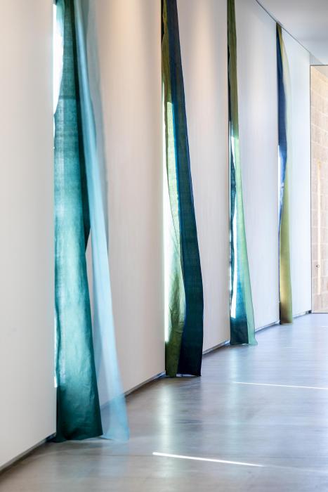 What falls from view (2019) is a series of curtains lining the gargantuan halls of the TarraWarra Art Museum. Using Indian fabrics (khadi cotton), silk organza and cloth hand-dyed with Australian native cherry plants and indigo, the tall curtains are hung to obscure the normally most-Instagrammed windows of the building, which look out to the picturesque hills around the TarraWarra Estate. In their obfuscation, visitors are prompted to imagine beyond the windows, while the sombre Symphony No. 1 ‘Da Pacem Domine’ (1991) by composer Ross Edwards, creates an atmosphere of foreboding, but also of meditation. Viewers, depending on their own experiences of the site and its surrounds, and depending on their own concept of What falls from view, are forced to recall traces throughout their whole bodies—through every sense, and think it through in relation to Sandrasegar’s exploration of trade materialised. Close your eyes and imagine what stood here only 250 years ago, and how journeys (and memories) were made (and at times, erased).