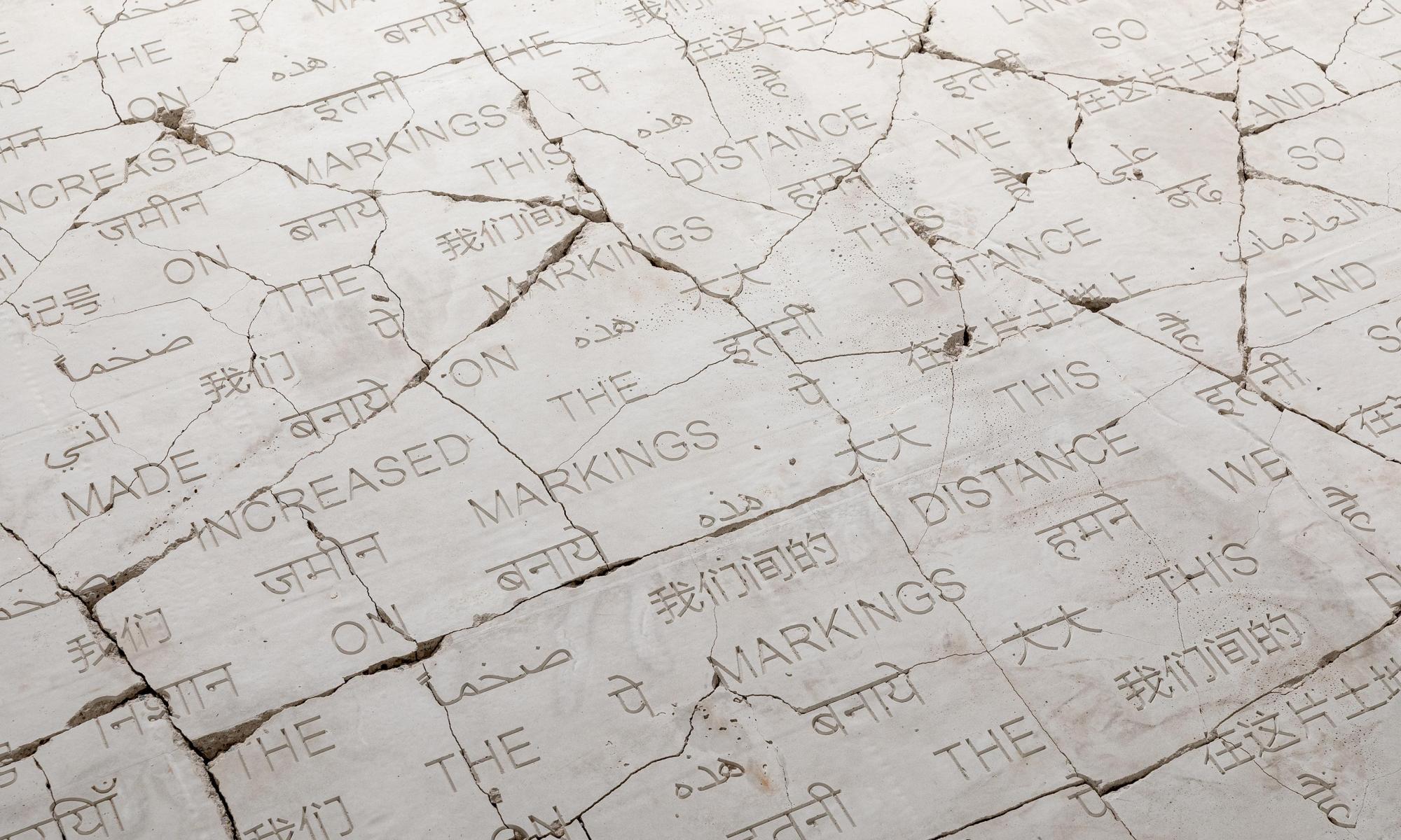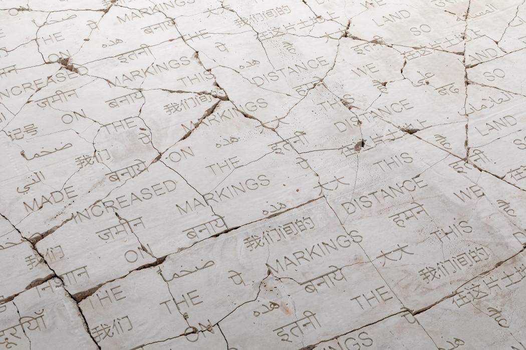 Indian artist Shilpa Gupta’s work similarly enforces a sense of your body in the space. In The markings we have made on this land have increased the distance so much (2019), the artist has engraved the title of the work translated into four languages—English, Hindi, Arabic and Chinese—repeatedly on a slab of concrete. The concrete is broken into small pieces, some the size of a golf ball, others a small loaf of bread, and at the exhibition’s opening weekend, visitors were invited to take pieces of the work home with them, thus creating a new kind of trace, from a work whose interpretation is one of poetic anti-colonialism, a zooming in and localising, and also a broadening in regards to globalisation. It would have been nice if Gupta had been permitted time and energy for a new commissioning of this work which included a translation in the local Woiwurrung language (of what can be known), as the exhibition’s explanation of the work focuses on the marks left by invaders and felt by First Peoples. [3] Visitors will once again be invited to take pieces of the work with them as they leave, at the closing of the exhibition. [4] Would a redistribution to a site suitable for the material to further break down have more intended effect than sitting on a mantelpiece? What will be left on the gallery floor when the exhibition is over?