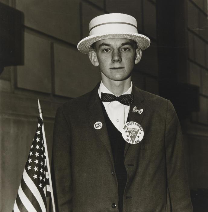 Seen through the psychopolitical fog of America’s current decline, Child with Toy Hand Grenade in Central Park (1962), Boy with a Straw Hat Waiting to March in Pro-War Parade, N.Y.C. 1967 (1967) and A Family on their Lawn one Sunday in Westchester, N.Y. (1968) can be viewed as timeless portraits of the violence and banality embedded in American culture. Her ‘gap between intention and effect’ epitomises the perception of America on the global arena today—one attempting to convey power and influence, but instead appearing ignorant and corrupt. These works say, ‘this is how it feels to be seen’ in all our ugliness.