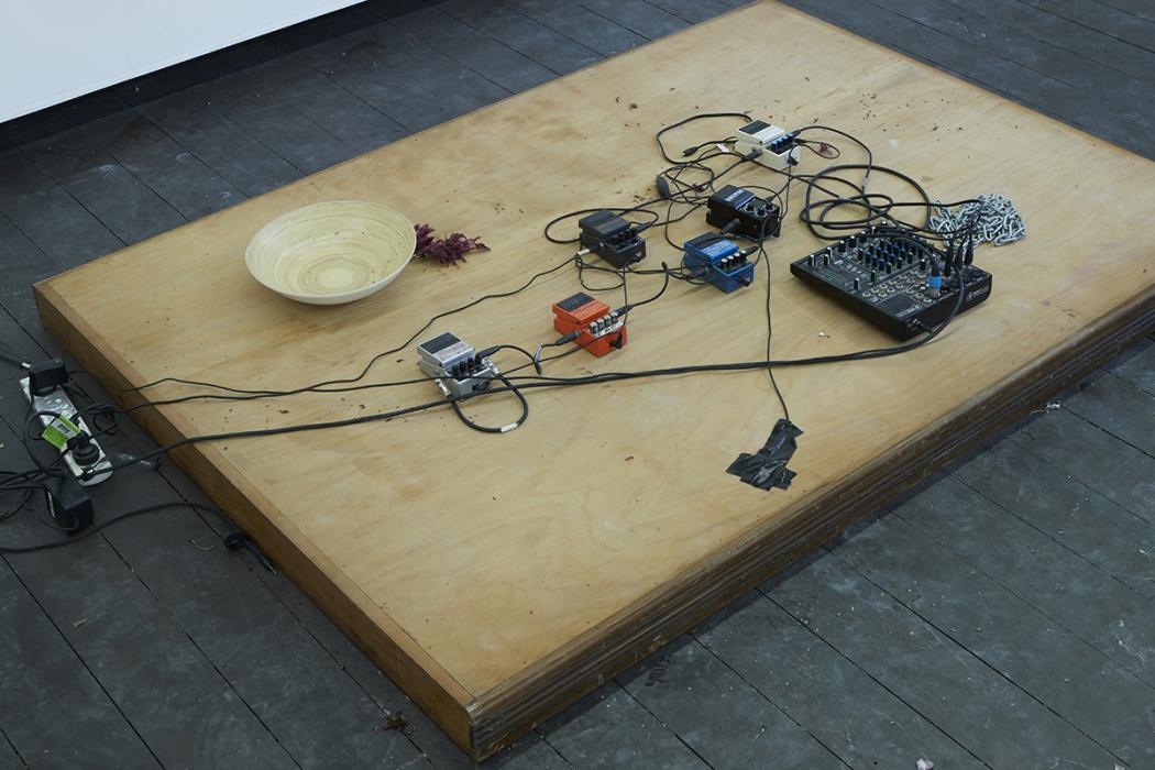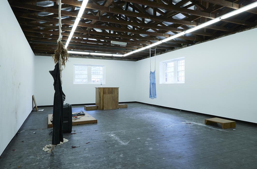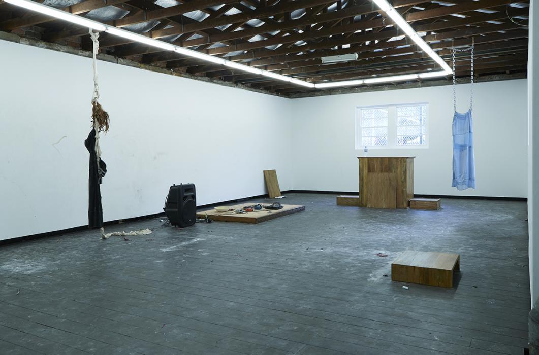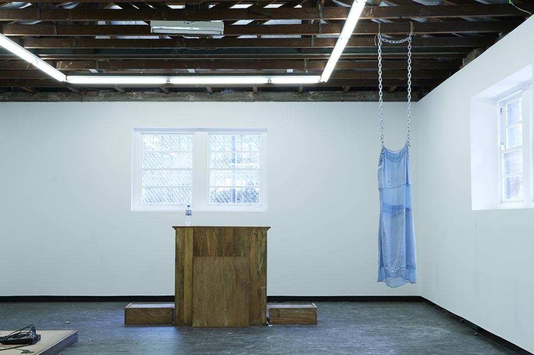 Forming in Melbourne in 2015 the performance art vessel, Embittered Swish, most recently presented Our Lady of the Flowers: Refracted, an exhibition and performance project at Firstdraft (Sydney). This project elaborated on a previous stage show mounted by Embittered Swish in 2016 at La Mama Theatre (Melbourne) that took as its starting point Jean Genet’s novel, Our Lady of the Flowers (1943). The Sydney iteration was a more abstract exploration of this text and a departure from the theatrical form. In the gallery space were positioned various wooden platforms, one of which was a low platform that displayed a mixer and distortion pedals entwined with metal chains. Down the far end of the gallery one of these platforms, centrally positioned, took the shape and solemnity of an altar. Slips and wigs were suspended from the rafters. A mechanised sculpture draped in lace, circled a mannequin’s hand. The floor, marked and strewn with flowers, retained the traces of performances that had taken place earlier in the gallery. Attending Our Lady of the Flowers: Refracted one Saturday afternoon, I witnessed a series of compelling performances including a movement piece in the heavy Sydney rain, improvisatory amyl sniffing, sonic sorcery, and many desirous embraces between the performers.