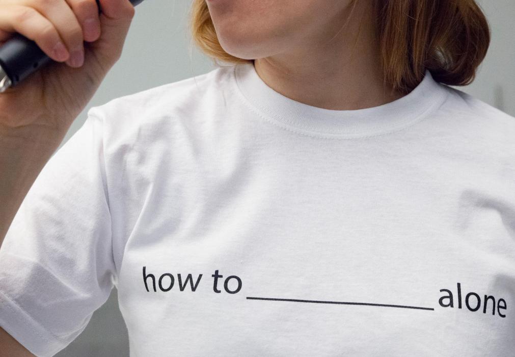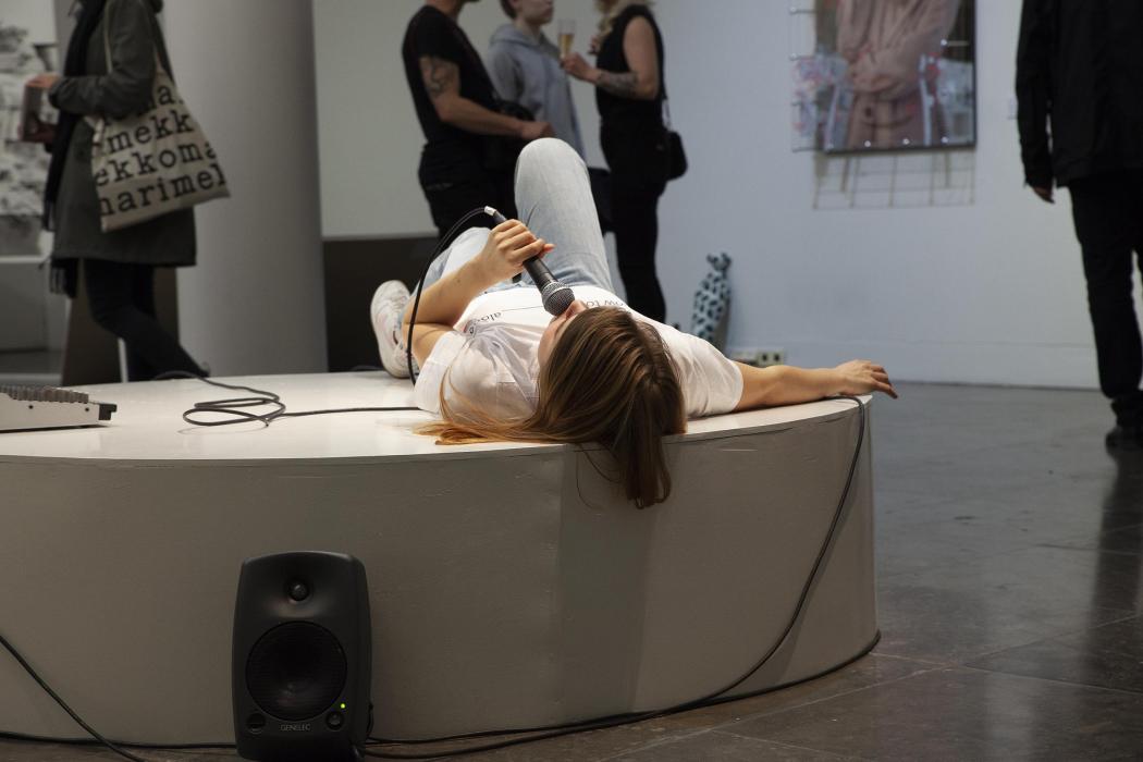 Each year in the Spring (‘Kevät’), the Academy of Fine Arts holds its Masters graduate exhibition, Kuvan Kevät. This year, Anne Naukkarinen presented a project titled How to _______ alone, (2018). The work consisted of a circular stage, AV equipment, a durational performance, and merchandise. Over several days of the exhibition, Anne sweetly and melodically sings the phrase ‘how to work alone’ to whoever else is there while she ‘works’ the stage, the room, the microphone. She is wearing a T-shirt which is also available for purchase from the exhibition attendant. She is making eye contact, and the microphone cable is long enough for her to move freely through the space, and sing directly into my face.