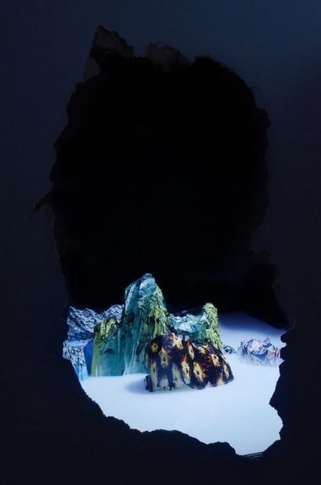 The main gallery featured a video art take on this kind of online perversion. Jon Rafman’s Still Life (Betamale) (2013) remixes this kind of material into a screen within a screen.(2) But it is the intimacy of the changing cubicles that best simulates the way the internet remakes the distinction between public and private, as one man’s perversion meets the voyeurism of a micro-community of subscribers. In a final cubicle Smithee broke through the back wall to install a white, highly chlorinated pool floating a series of hypercoloured, folded islands, with Google’s Siri reading text from a reddit group about men’s rights overhead. It is as if we have reached Red Pill’s reptilian brain, a psychic picture of the minds of those who both hide behind and expose themselves on the internet.