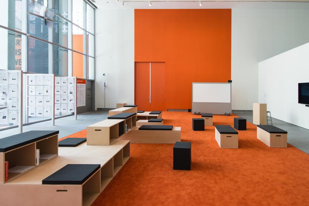 Paired with teaching essentials (whiteboards, mic/speakers, and a screen), a series of modular cube seats made of mdf board and foam are scattered above a large orange carpet where the students sprawl. The energetic hue of the carpet extends from underneath the cubes to the wall, and spills out onto an external wall, visually connecting the Escuela to a courtyard where participants huddle between sessions to continue their discussions or to have a bite under the sun. Out in the courtyard, above eye view, a customisable marquee visible from the street delivers messages from the students—such as ‘art is a verb,’ ‘use the museum’ and ‘u r not a loan’—to the outside world. These paired-back yet deliberate elements of design tie the space together and bring to mind a Bauhausian use-driven kind of simplicity.
