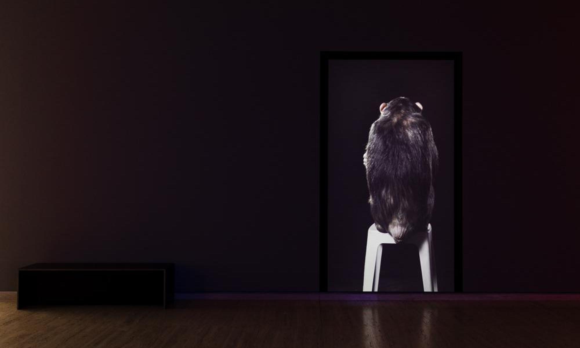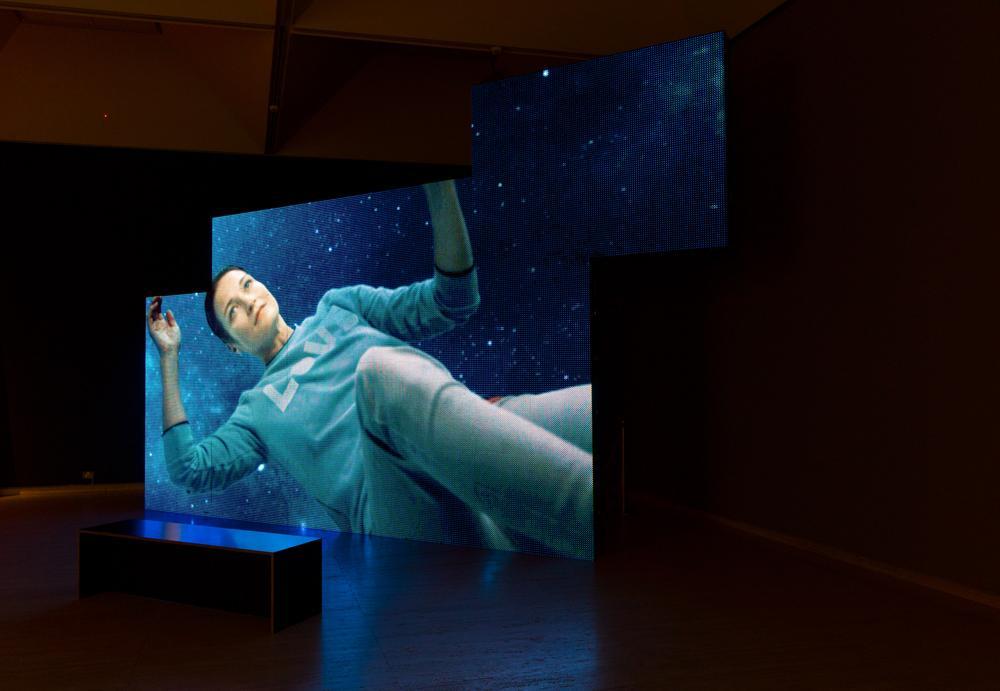 Descending towards the lower ground floor of the Art Gallery of New South Wales (AGNSW) meant being confronted with scenes similar to religious worship. Finnish artist Eija-Liisa Ahtila’s video sculpture Potentially for love—mahdollinen rakkaus (2018) sat glowing from the chasm of a dark room, illuminated by both its own LED fabrication and a vanguard of glistening phones thrown up before it. The left wall shone with a projection of a female chimpanzee perched on a stool. She faced away from us—absent and inattentive—fiddling, but never fully looking back. At the centre of the room was a jagged, monumental structure shimmering with neon blue pixels, coagulating to form a floating human body drifting somewhere in the Milky Way. As the figure ebbed closer, she invited us to join her in weightless serenity. Ahtila’s concern with the relationship between human and animal was made clear with two interactive stations, whereby audiences could place their arms underneath a screen to see flesh and fabric transformed into that of a chimp’s.